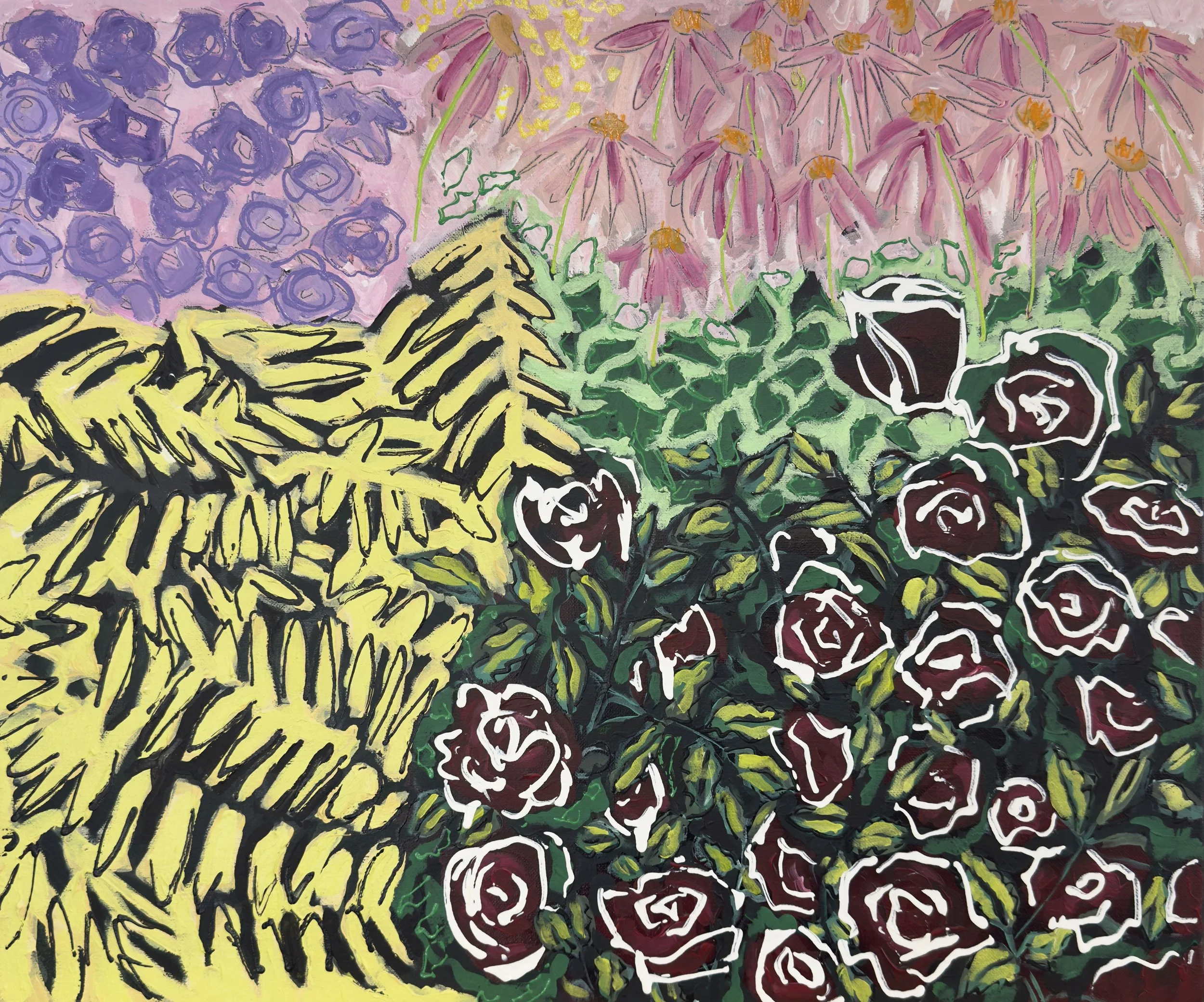 Bubblegum Coleus and Friends, Acrylic on Wood Panel, 9” x 12”