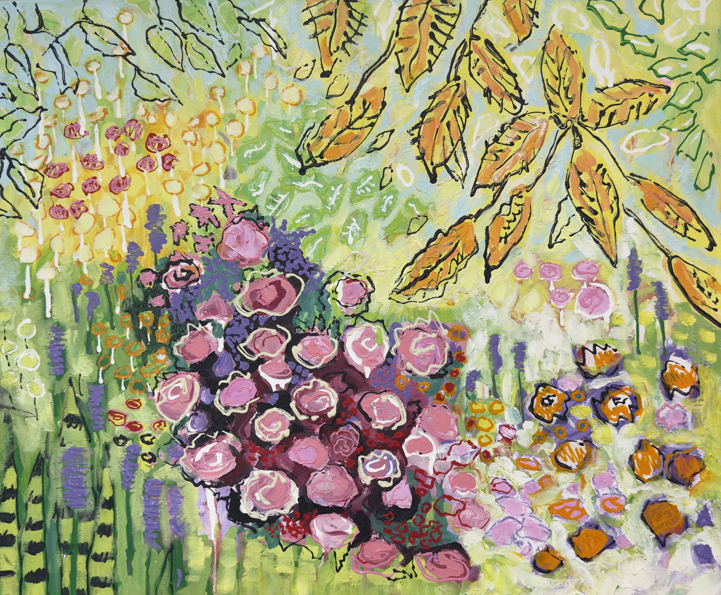 Springtime, Acrylic on canvas, 20” x 24”. Includes canvas Floater Frame in Black