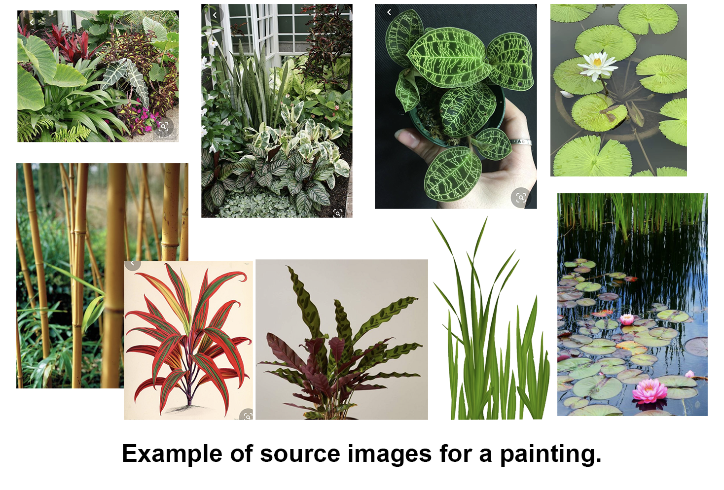 A digital collage of images are merged to create a draft of a painting.