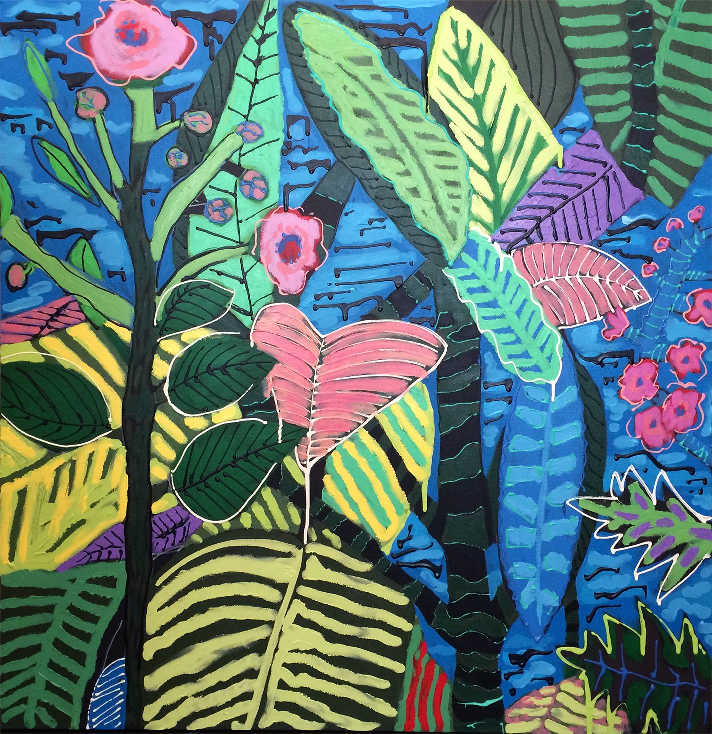 Pink flowers in meadow, acrylic on canvas, 36' x 40", SOLD